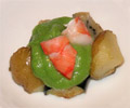 ●お麩のクレソン味噌田楽 胡麻の入ったお麩、新じゃが、茄子の上にはキレイな緑色のクレソン味噌がかかっていて、鮮やかな赤色の海老が乗っています。甘みのある味噌田楽になっています。