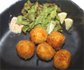 真ん丸コロコロのコロッケの中にはおから、ベーコン、枝豆が☆衣はさっくり、中はふんわり。やわらかく仕上がっています。胡椒と塩を混ぜたものを少しだけつけていただきます。お好みでレモンをかけていただくのもサッパリとしていいかも♪